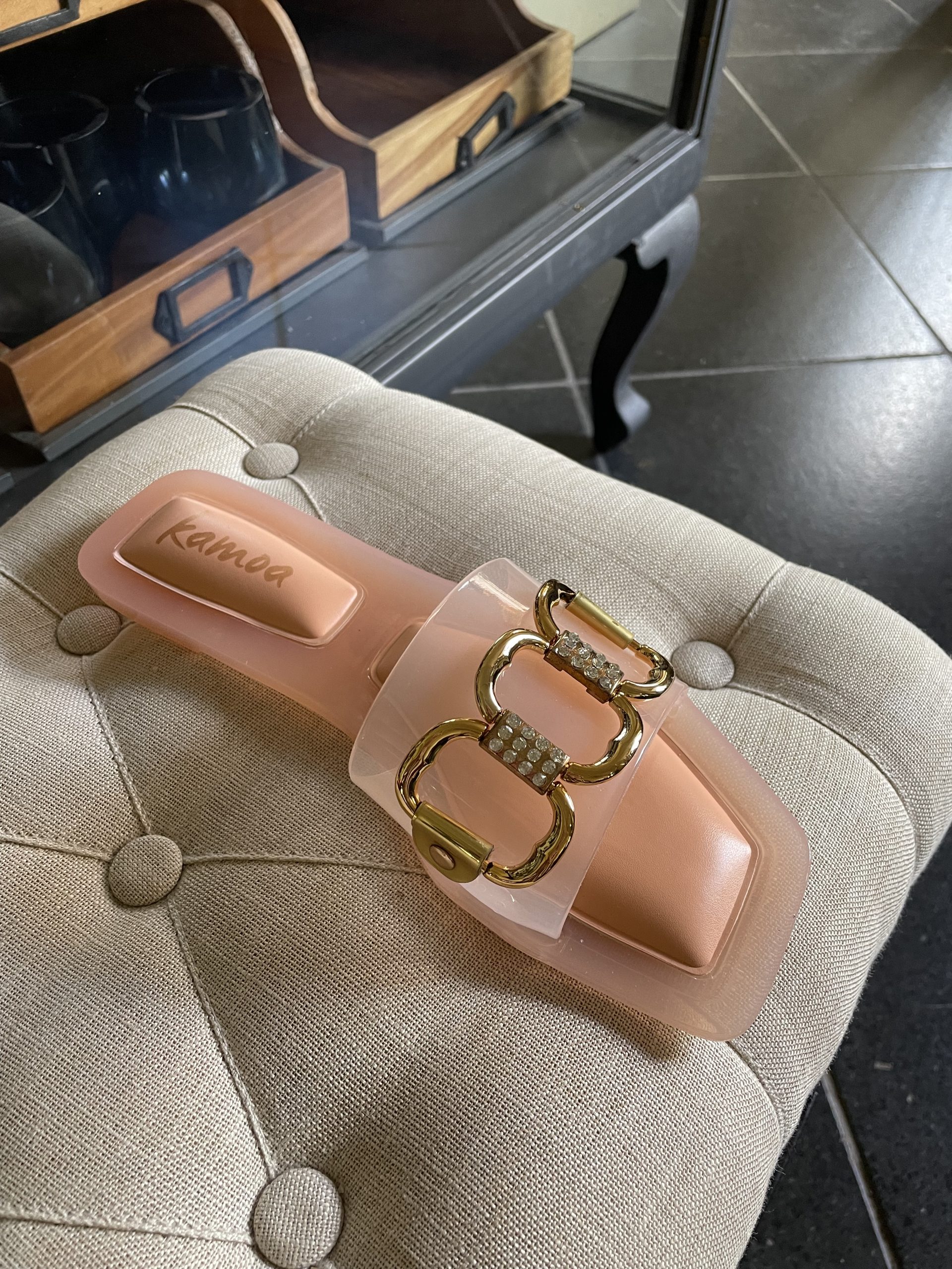 Entdecken Sie die ultimative Kombination aus Stil und Komfort mit unserer eleganten Damen-Pantolette mit exquisiter Goldverzierung. Hergestellt aus hochwertigem Material, vereint sie zeitlose Eleganz mit modernem Chic. Die goldene Verzierung verleiht jedem Schritt einen Hauch von Luxus, während die gepolsterte Sohle für den ganztägigen Tragekomfort sorgt. Perfekt für die Badesaison oder um Ihrem Alltagslook einen Hauch von Glamour zu verleihen. Gönnen Sie sich das Beste und treten Sie mit Stil auf!